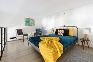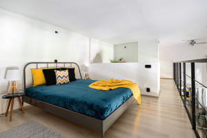 Az emeleten: tágas hálószoba és egy dolgozósarok, amely ideális home office-hoz vagy alkotómunkához.